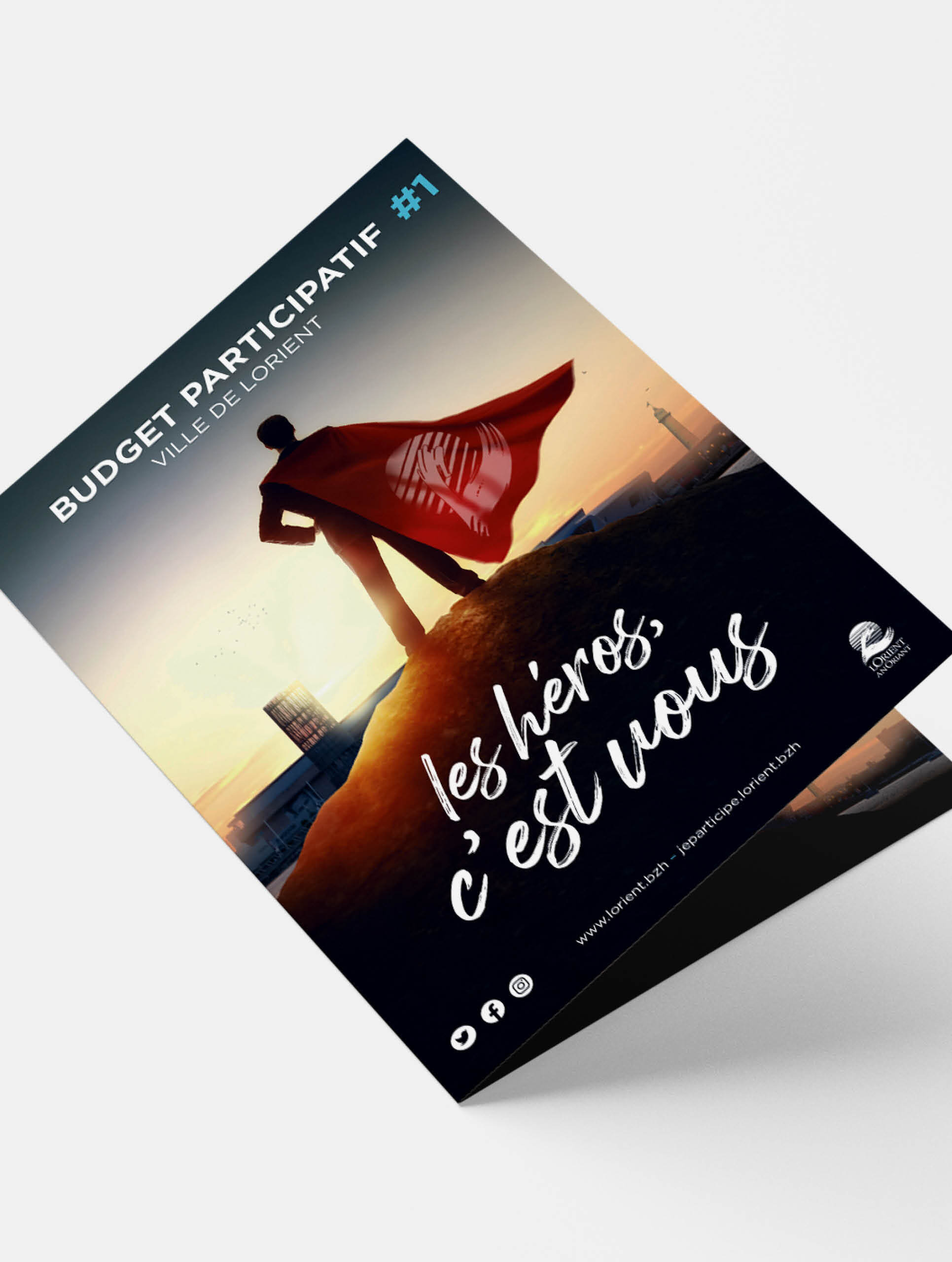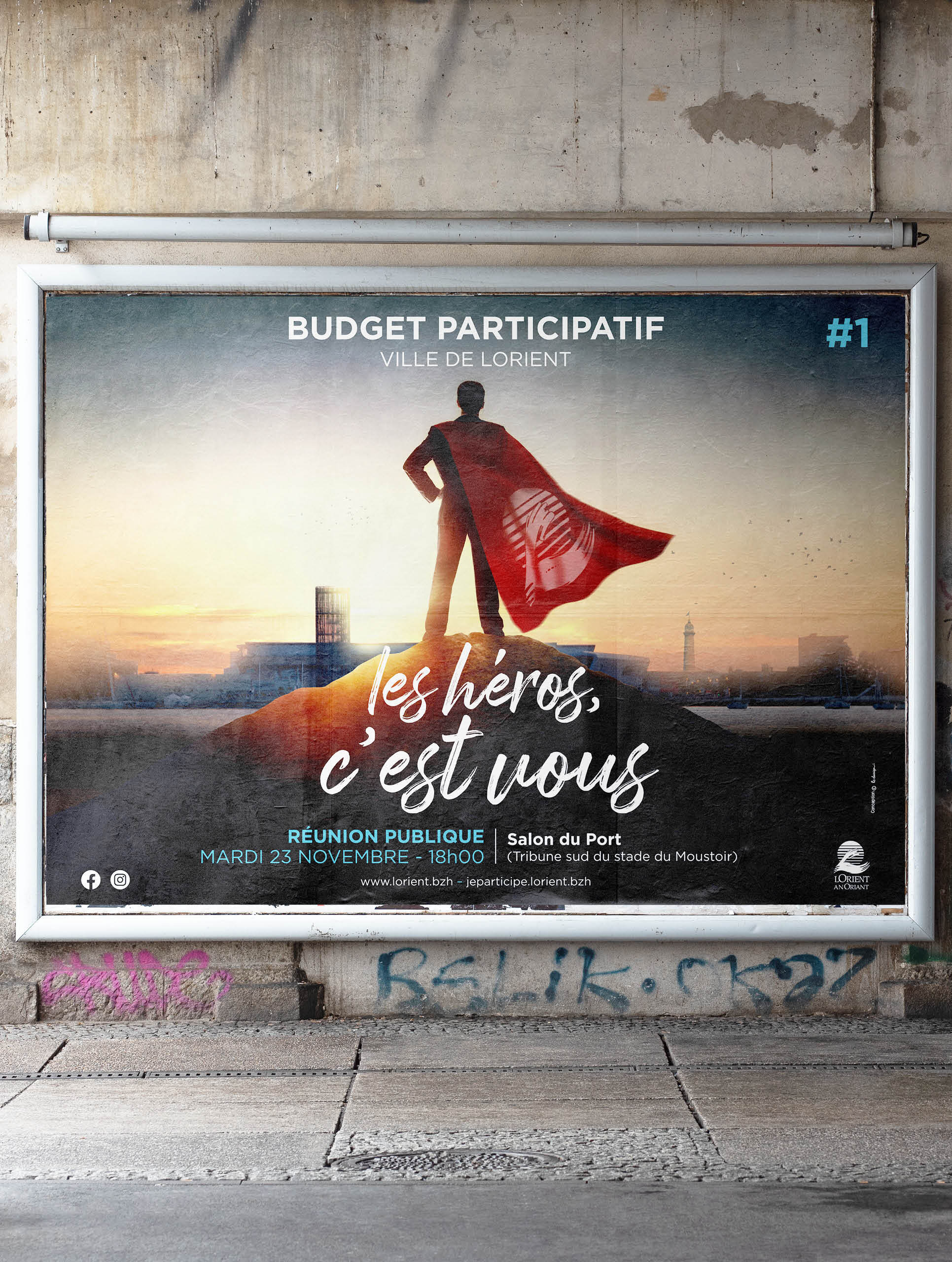 Conçue comme une affiche de film, elle représente un super-héros de dos, dont la cape est marquée du logo de la ville. Les Lorientais peuvent se projeter dans ce personnage. Il est juché sur une colline qui surplombe la ville de Lorient, la tour de la découverte et la tour des vents en fond. Une variante avec une femme a également été conçue, et chacune est utilisée selon les supports.