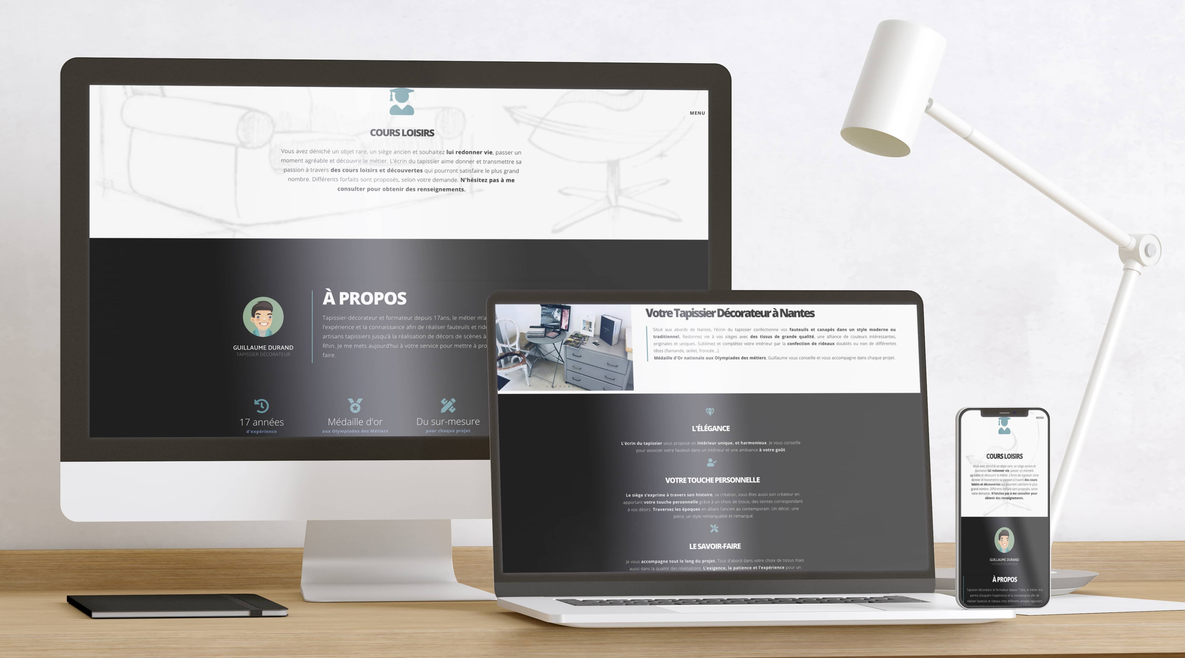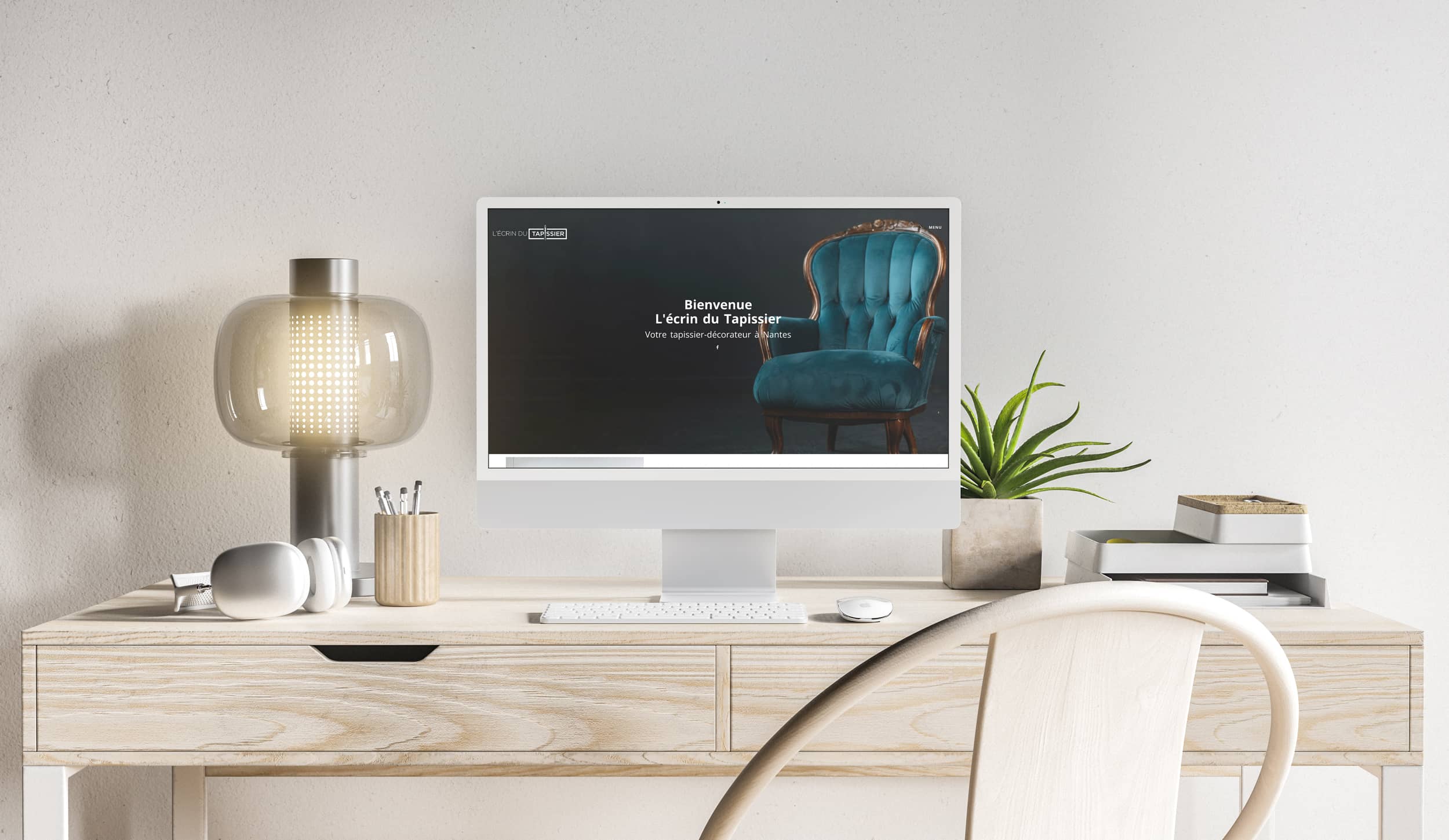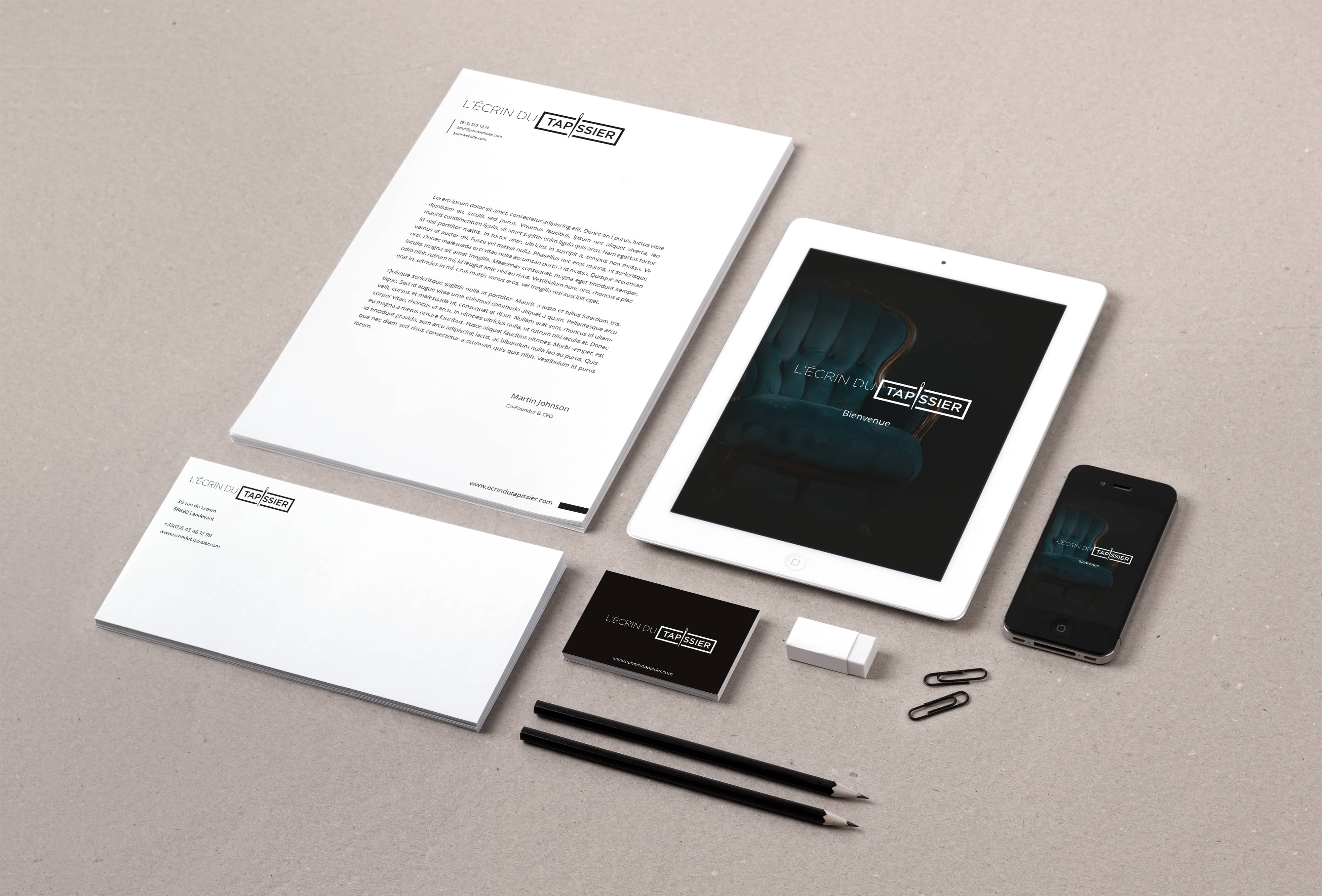 Le brief de l’écrin du tapissier était de casser les codes de la tapisserie, qui peut avoir une image « datée ». Il souhaitait une image classe, épurée, reflétant le coté sérieux de son métier et son expérience (médaillé d’or aux olympiades des métiers).